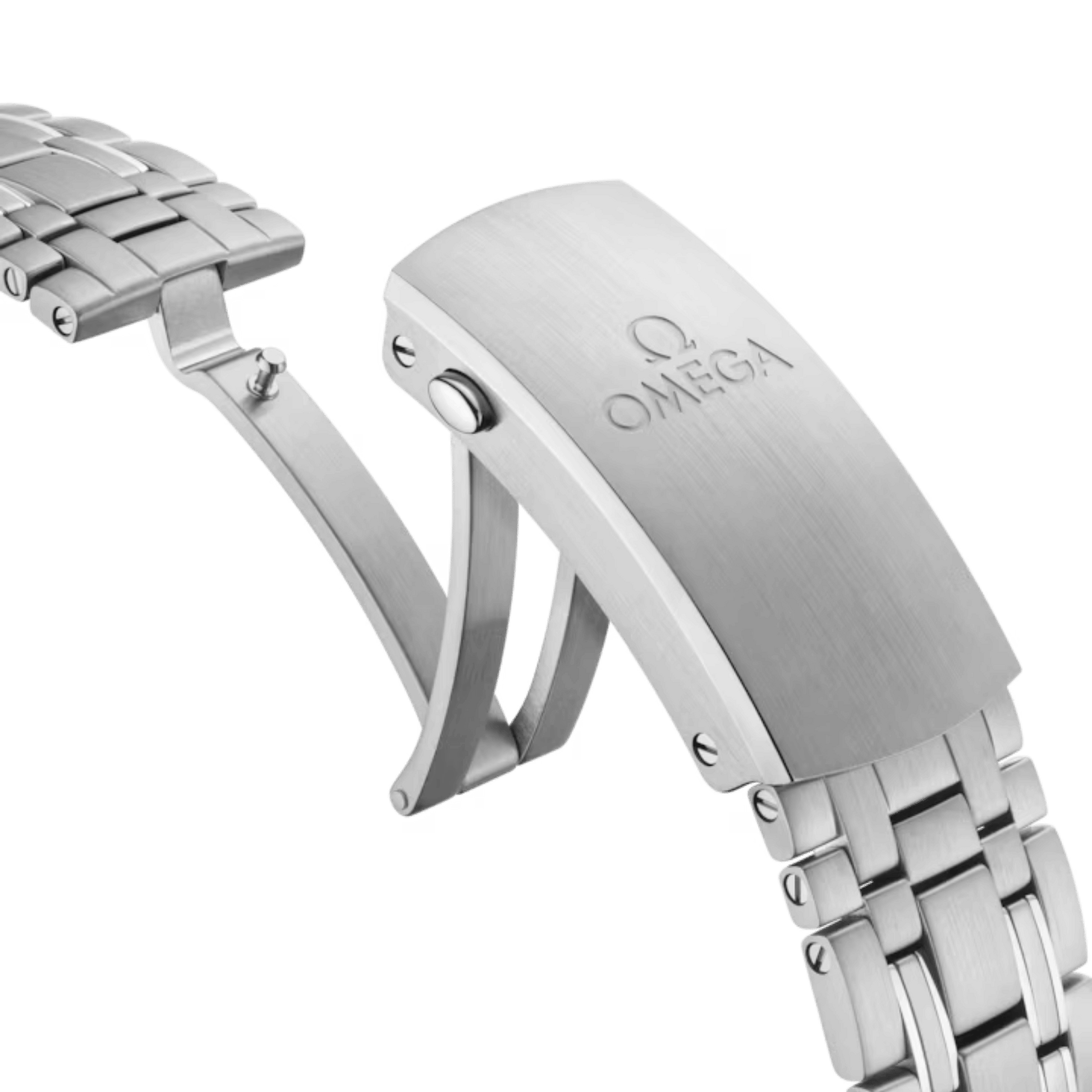 The watch is presented on a stainless steel bracelet and is driven by the OMEGA Master Chronometer Calibre 8800, which can be seen through the sapphire-crystal on the wave-edged caseback.