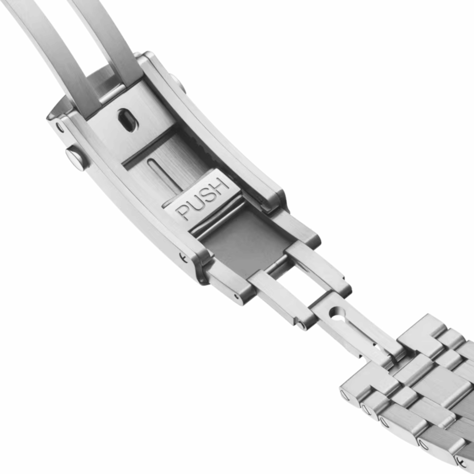 The skeleton hands and raised indexes are rhodium-plated and are filled with white Super-LumiNova, while the helium escape valve has been given a conical design.