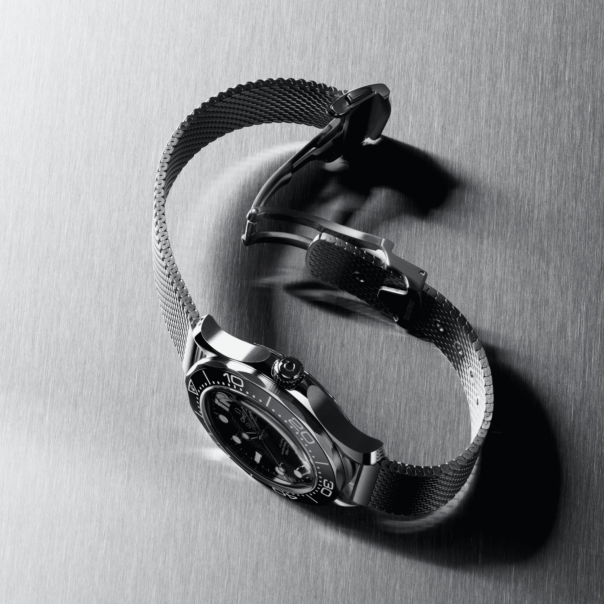 Black aluminium is also used to create the dial, which is laser-engraved with the Diver’s iconic wave pattern. The skeletonized hands and indexes are rhodium plated and filled with white Super-LumiNova, while the other markings, including the OMEGA logo, are transferred in white.