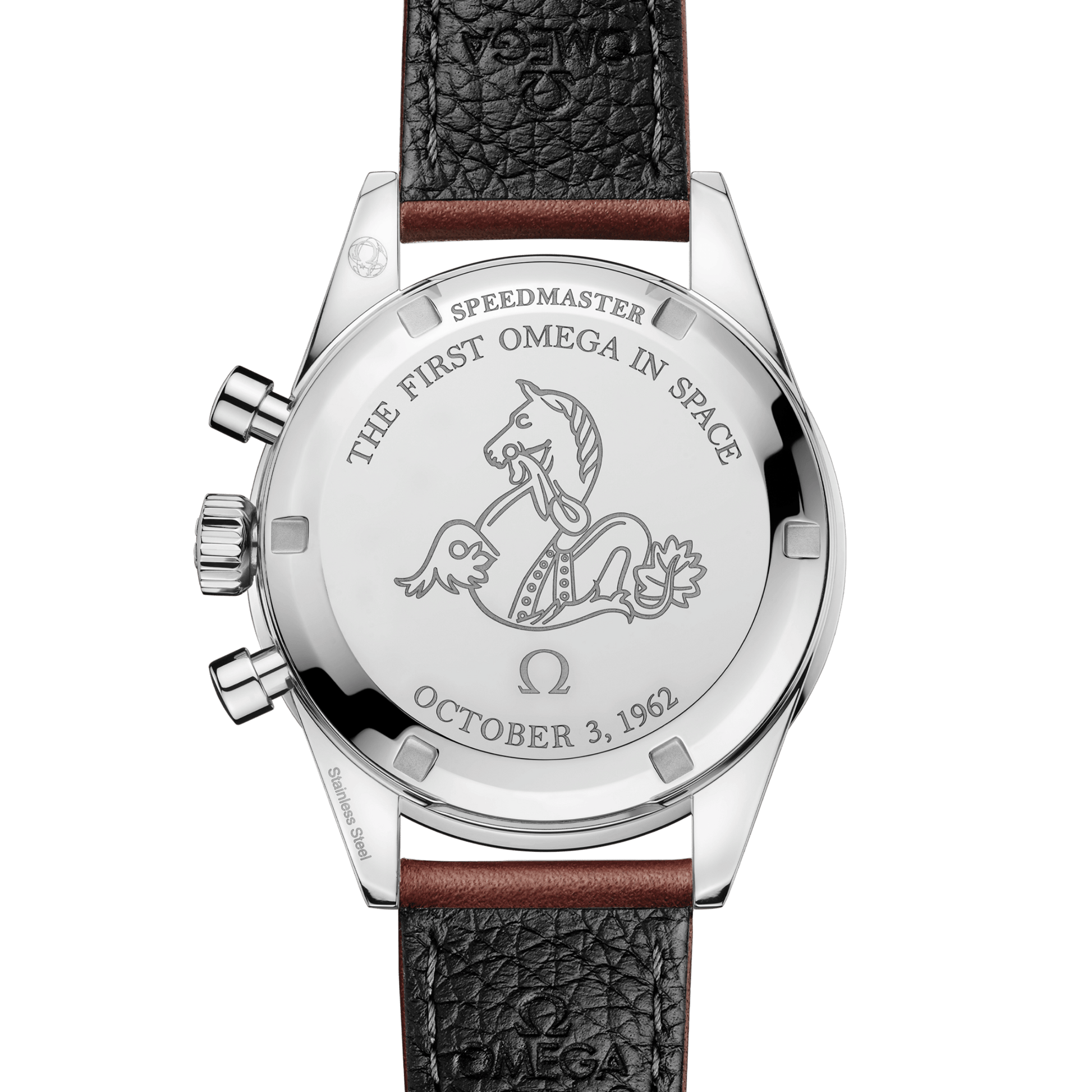 A vintage OMEGA logo is applied on the dial, as well as on the crown, while the caseback features the famous Seahorse medallion, and the engravings, “THE FIRST OMEGA IN SPACE” and “OCTOBER 3, 1962”.