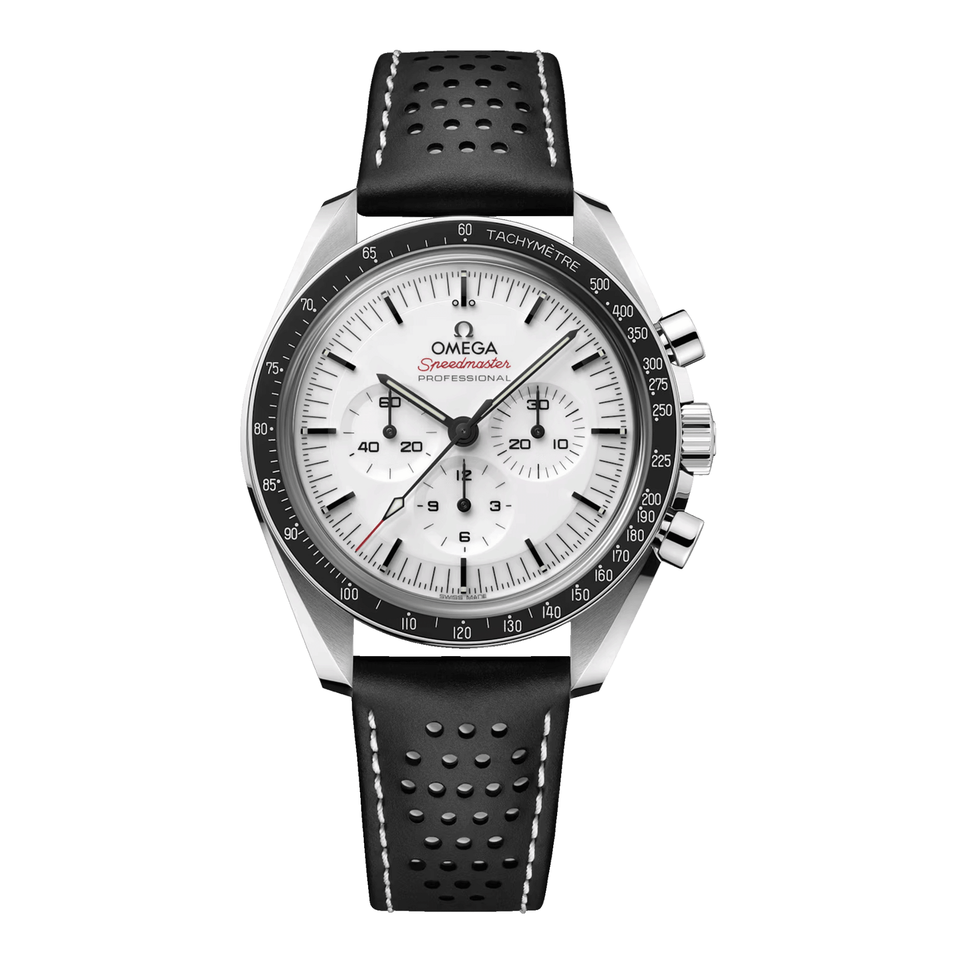 Presented on a black micro-perforated leather strap with red and white stitching, this 42 mm Moonwatch in stainless steel features sapphire crystal glass on the front as well as on the caseback. Inspired by the 4th generation Speedmaster style worn on the moon, it also includes an asymmetrical case, a white lacquered step dial with applied OMEGA logo and indexes, Moonwatch style hands, and the famous dot over 90 on the black anodised aluminium bezel ring.