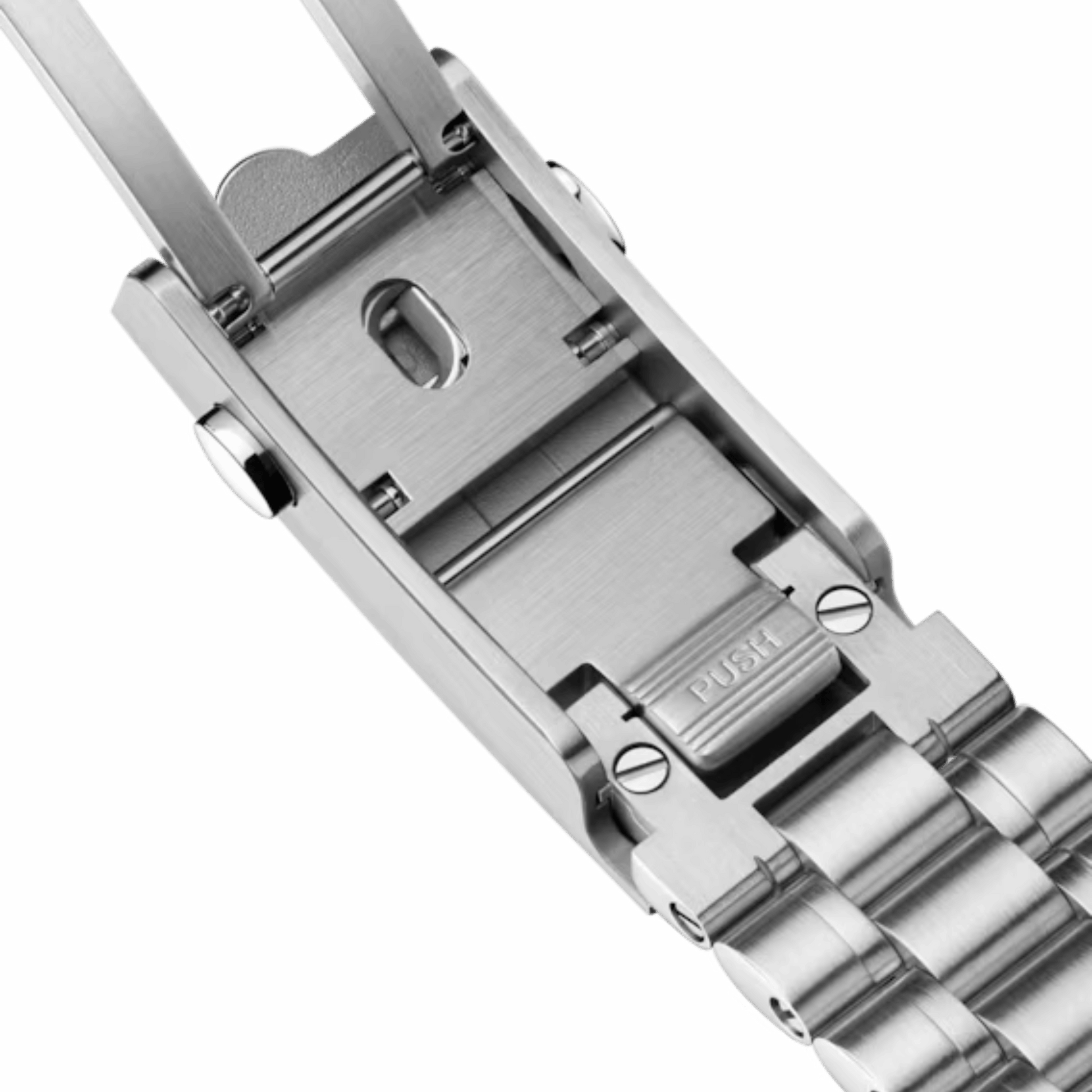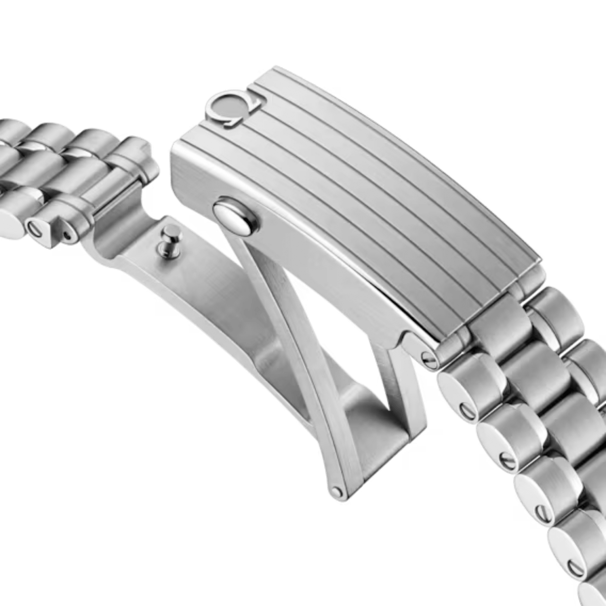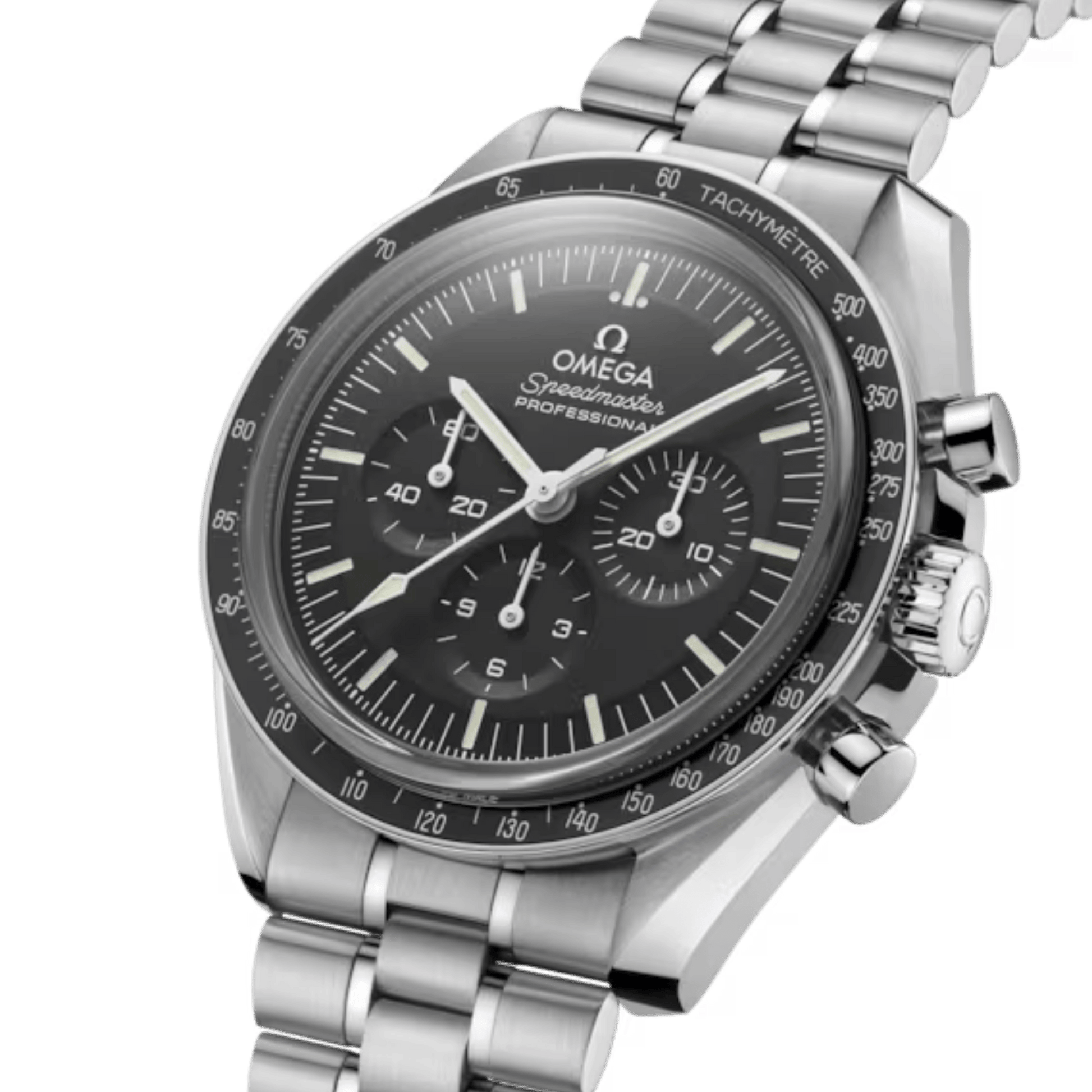 Presented on a polished-brushed five-arched-links-per-row bracelet, this 42 mm Moonwatch in stainless steel features sapphire crystal glass on the front as well as on the caseback. Inspired by the 4th generation Speedmaster style worn on the moon, it also includes an asymmetrical case, black step dial with applied OMEGA logo and the famous dot over 90 on the anodised aluminium bezel ring.