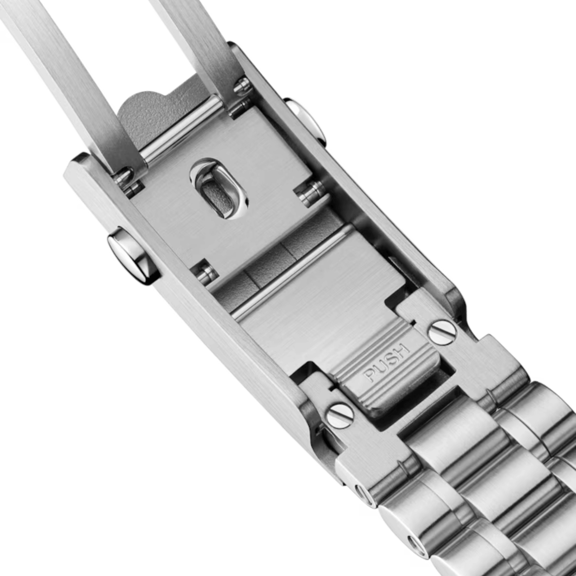 Presented on a brushed five-arched-links-per-row bracelet, this 42 mm Moonwatch in stainless steel features hesalite glass on the front and an embossed Seahorse medallion on the caseback. Inspired by the 4th generation Speedmaster style worn on the moon, it also includes an asymmetrical case, black step dial and the famous dot over 90 on the anodised aluminium bezel ring.